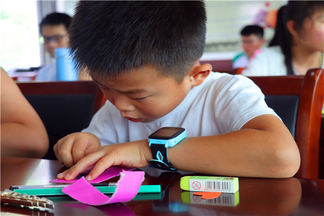 在今天的手工课上,孩子们分为六个小组,在志愿者老师们的指导下以小组为单位制作手工作品,作业是卡纸拼画,不限内容,肆意畅想,只做自己所喜欢。大家迅速拿出早已备好的裁刀、卡纸、水彩笔等等,放眼望去,梦想与希望在孩子们的作品中展现得淋漓尽致。他们以彩色卡纸为大地蓝天,提起蜡笔作梦想家园,向志愿者们展示了他们心中的世界与明天。世界在他们眼中狭小而缤纷多彩,没有复杂的高科技和浩瀚无际的宇宙,只有所在身处的这美丽自然和碧绿清秀的一方净土。清凉的池塘,修长的小溪,这里的孩子似乎都对“水”情有独钟;青蛙、游鱼、小鸟,这里的动物在他们口中是家人、是朋友,他们对大自然的亲近与热爱,城市里的孩子无法比肩,换一种方式而言,这些或许正是城市所正在失去的、纯粹而美好的东西。