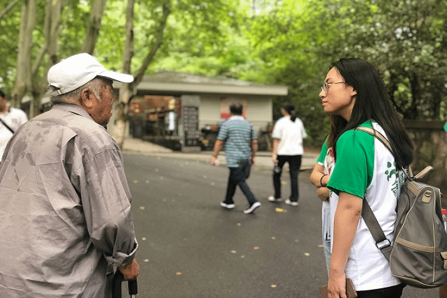 调研团队刚刚走入烈士陵园内部,就碰到一位老爷爷来和队员们义务讲解。老爷爷名叫凌健身,江苏泰兴人,毕业于东南大学土木工程系,1998年退休后来到雨花台烈士陵园义务讲解,至今已有20年。凌健身爷爷说,建筑里面有语言,雨花台的每一处建筑都有故事。“我喜爱建筑,因此希望更多的人能理解设计师的意图,想让大家知道原来建筑里面有这么多的文章。” 关于雨花台里的建筑,凌健身爷爷有着自己的见解。“雨花台烈士群雕上来7级台阶,代表‘头七’;雨花台烈士群雕下来,两边各栽种松树5棵,代表十全十美。”时光荏苒,纪念馆两边的龙柏树从一棵棵小树苗长成可以遮阳挡雨的大树。“中国人是多么有文化啊!道路两侧种的龙爪槐,寓意龙的传人要永远怀念革命先烈;涌泉广场代表滴水之恩当涌泉相报,只有理解了文化才能看懂设计师的用心。”老人继续向我们介绍着雨花台烈士群雕,最前面的是工人,代表着,中国的革命是由工人阶级领导的,工人搂着的是报童,这里的报童是地下工作者,工人左边的男子代表的是知识分子,他低着头在思考中国的前途与命运,在他们身后的是军人,代表着中国人民解放军是人民坚强的后盾,最左边的是带着枷锁的农民,代表着没有知识,使他们的命运被枷锁所封锁,而右边的则是妇女儿童,表示中国的革命是一个全民参与的斗争,在他们的身后,是带着乌蓬帽的商人,代表着中国的经济基础。