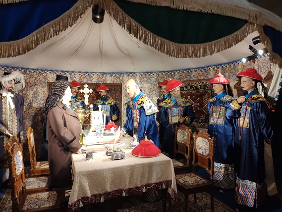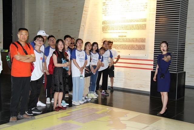 进入陈列馆后队员们开始认真倾听讲解员的讲解。陈列馆分为五大部分,主要是“黑龙江是中国北方民族的母亲河”“十七世纪的黑龙江流域和中俄《尼布楚条约》”“十七世纪至十九世纪中叶的龙江流域”“十九世纪下半叶的黑龙江和中俄《瑷珲条约》”以及“‘庚子俄难’和‘重建瑷珲’”。五大部分按照时间顺序,先是展示了古代黑龙江流域的自然资源以及民族情况,展示了这里的繁荣富庶。之后便是从俄国人来到远东地区对黑龙江流域进行侵扰开始,展现中国人民抗击外来侵略的历程。在清王朝的鼎盛时期,强大的清帝国依然能够阻止刚刚到来的俄国人的侵略。于是通过一次次的胜利,中俄签订了中俄关系史上的第一个平等条约《尼布楚条约》。条约中中国维护住了自己的主权和领土完整,但这种有利态势伴随着清政府的狂妄自大和腐败无能而迅速消失。仅仅一百多年后,中俄再次坐在了关于如何划分东北地区的谈判桌上,但此时的中国只能是处于俄国要什么中国便给什么的被动局面。随着《瑷珲条约》和《北京条约》的签订,中国失去了黑龙江以南,乌苏里江以北的一百多万平方公里的广大土地。中国人民并未因此放弃抵抗,随后的义和团运动席卷全国,包括黑龙江地区,但这却只能够激发侵略者更加贪婪的欲望。于是在刚刚进入到20世纪的时候,黑龙江两岸的中国人民便遭到了俄国人的血腥屠杀。“江东六十四屯惨案”和“海兰泡惨案”发生了。