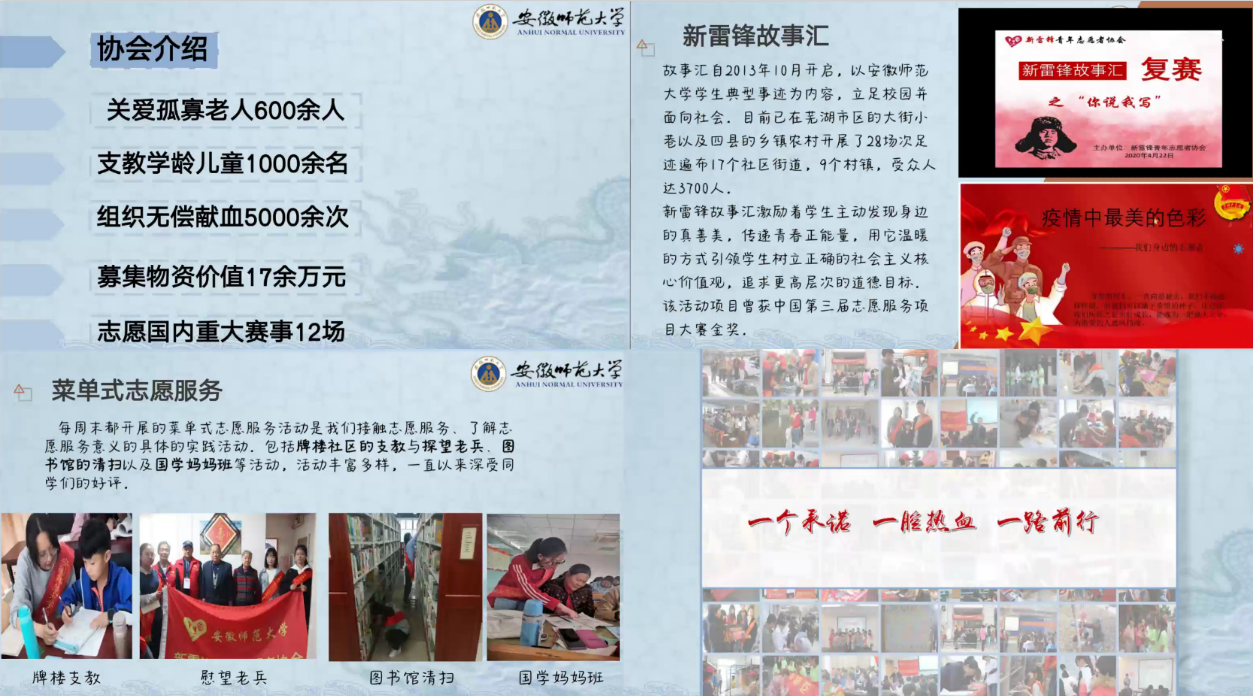 新雷锋青年志愿者协会荣誉枝干的成长,离不开理事与会员们这些细小根须的给养。一张完整的幻灯片展示了会员的详细权益,通过会员的学习了解以及社团的责任承担,将更好地落实相关权益的保障工作,进一步推动协会自身发展,使得志愿服务遍地生花。新雷锋青年志愿者协会的精品活动作为会员们参与的主要活动也被不厌其详地介绍。会员们可以通过参与新雷锋故事汇,用文字的力量开垦真善美的净土,也可以用十二五义卖中挥洒的汗水给繁昌县新林小学的贫困生带去力量与希望。社团的每一个志愿活动都殊途同归,同时也都需要新雷锋青年志愿者协会会员们的积极参与。