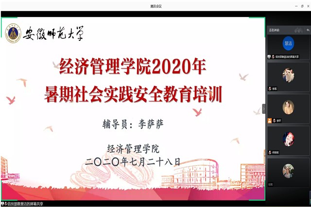 启动仪式后,为保证暑期社会实践的顺利进行,公司开展了暑期社会实践安全专题培训会。辅导员李萨萨是暑期社会实践安全教育主讲人。会上她提出了安全是人生、财产安全的切实需要,是社会志愿服务的基本要求,并以十个注意、两个重点、四个严禁、三个务必来提醒同学们在实践中注意自身的人身和财产安全,希望同学们一切顺利。