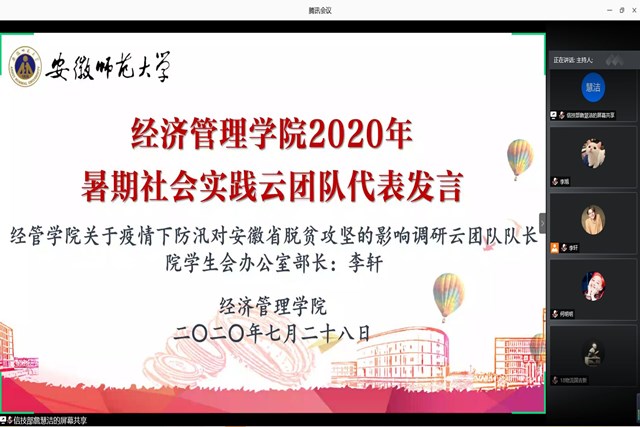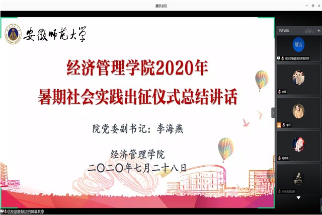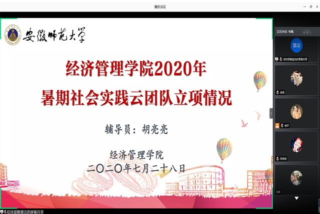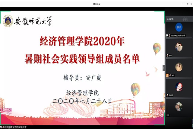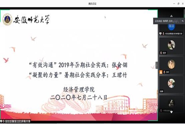 会议伊始,院团委书记吕洋介绍了2020年暑期社会实践基本情况和三个基本原则。共481名员工参加此次暑期社会实践,23支云团队,173人参与个人实践。其中,吕洋格外强调了外出实践的安全性。辅导员安广虎宣读了m88官网2020年暑期社会实践领导组成员名单。辅导员胡亮亮宣读了m88官网2020年暑期社会实践云团队立项情况,关注当下时事热点,在疫情影响、防汛救灾、云课堂等方面展开实践。院员工会办公室部长李轩作为暑期社会实践云团队代表发言说到,暑期社会实践是磨练意识、接触社会、了解国情有效路径。只有贴近社会和群众,深入了解基础情况,才能进一步加强我们的责任感和使命感。