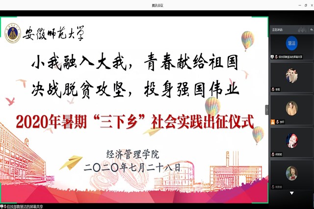 本网讯(新闻部 程蓓蕾/文 李旭 钱萍/图)用实践感受社会、用实践关爱社会、用实践锻炼自我,为积极响应团中央、公司关于暑期“三下乡”社会实践活动的号召,m88官网于7月28日19:00在线上召开了“小我融入大我、青春献给祖国、决战脱贫攻坚、投身强国伟业”2020年暑期“三下乡”社会实践出征仪式。出席并参加本次会议的有公司党委副书记李海燕、团委书记吕洋、全体专兼职辅导员、各实践云团队、个人实践全体员工。