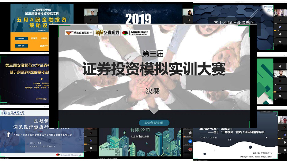 本网讯(经济学会 文汪萍 图秦鹏飞、孙燕华)为向同学们普及证券投资知识,深入了解资本市场的运行规则,提高证券投资实操能力,以赛促学,增强专业学习的兴趣和效果,第三届证券投资模拟实训大赛于2019年12月26日顺利展开,历经赛前培训会和初赛两个阶段,同学们都在证券投资领域都得到了很好的启示和锻炼。2020年5月30日,经济学会本着“延期不延学、延期不延赛”宗旨,以腾讯会议为媒介举办此次大赛的决赛。