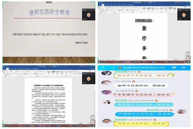 坚持推进安全至上,全面开展线上学习。积极响应公司党委、团委安全第一的实践理念下,团队通过开展线上安全会议加强团队成员的安全意识。团队安全员解读公司暑期社会实践活动医疗手册和带领学习公司暑期社会实践安全须知,以及结合团队各成员当地近期天气状况分析相关安全风险并提出具体的指导建议,逐步加深了团队成员对安全问题的认识和了解,学习好暑期社会实践“安全教育第一课”。此外,团队还进行每日安全汇报,确保每位实践同学的安全。