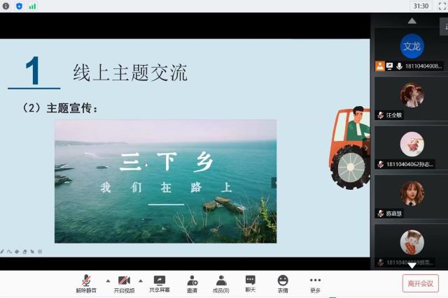 7月31日晚21:30云会议连通了各队员,“后疫情时代安徽省影院产业发展问题研究”的调研正式拉开了序幕,此次线上会议分为两大部分。第一部分为线上主题交流会,首先是追根溯源:“三下乡”指的是文化、科技、卫生三下乡,溯源于上个世纪八十年代。其次是主题宣传:队长陈文龙带领我们观看了《三下乡,我们在路上》的宣传片。最后是意义交流。