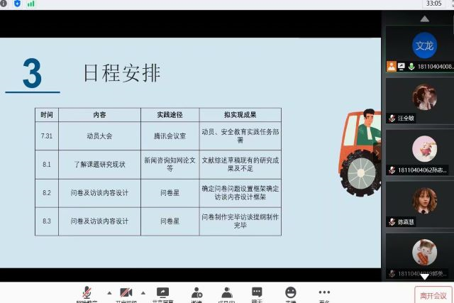 第二部分是调研动员会,首先队长给我们详细讲解了8.1-8.12的调研具体内容安排,然后进行了意见交流,针对日程安排及任务分配提出建议和反馈。