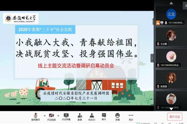 7月31日,“后疫情时代安徽省影院产业发展问题研究”的调研云团队于线上召开启动仪式,以“小我融入大我,青春献给祖国,决战脱贫攻坚,投身强国伟业”为主题召开了动员大会。