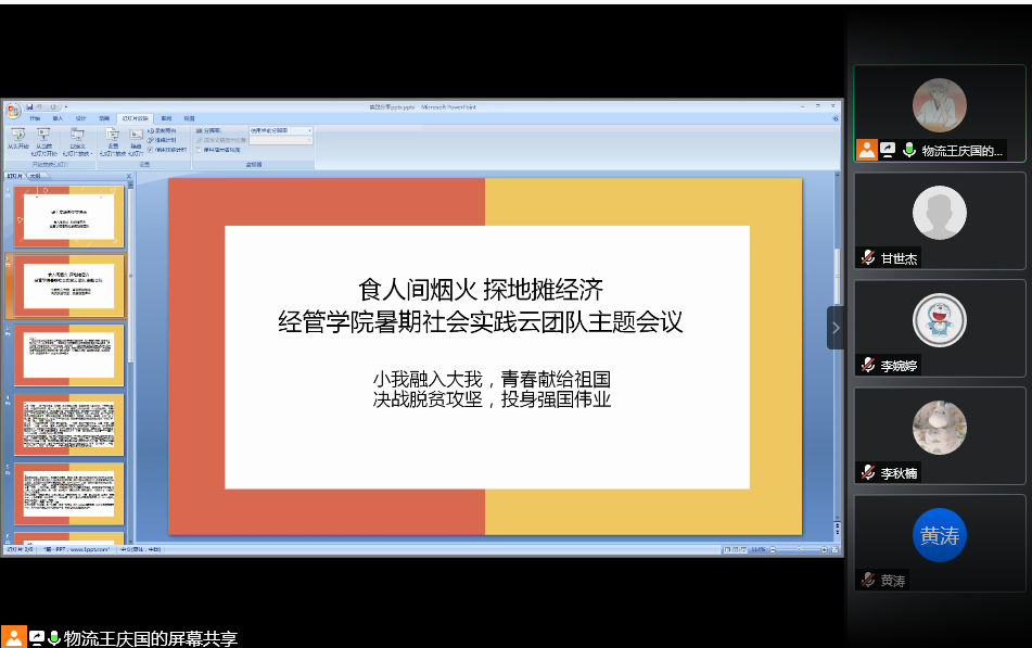 本网讯(m88官网 王庆国) “把学习奋斗的具体目标同民族复兴的伟大目标结合起来,把小我融入大我,立志作出我们这一代人的历史贡献。”习近平总书记在南开大学考察调研时勉励师生的话语,不仅回答了张伯苓董事长1935年提出的“爱国三问”,更激励我们要把爱国主义和奋斗精神转化为实实在在的行动。为此,8月11日晚,m88官网“探地摊经济,食人间烟火”团队开展了“小我融入大我,青春献给祖国,决战脱贫攻坚,投身强国伟业”的线上交流主题会议,队长王庆国为此次会议的主持人,队内15名成员全体参加此次会议。
