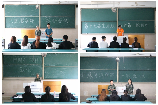 首轮面试分为自我介绍和评委现场提问两个环节。自我介绍旨在考验同学们的语言组织能力、仪表体态及情绪调控能力,而且可以让评委对选手们的性格有一个大致的了解。现场提问环节则主要考察了选手们的随机应变能力、工作热情以及是否能够端正态度、始终如一的热爱这个部门。面试的时候,面对评委们的提问选手们一直表现地落落大方、自信从容,给评委们留下了极好的印象。面试结束后,评委们纷纷表示这一届的新生有个性、有想法、有热情,有许多适合本部门的可塑之才。