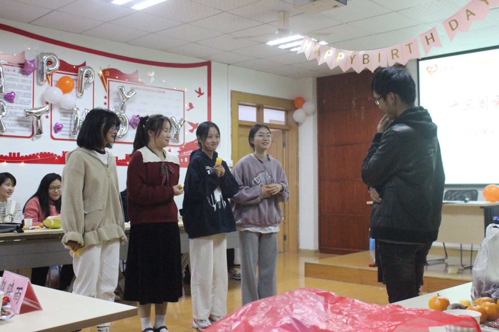 吃完蛋糕就到了有趣的游戏环节,此次晚会共准备了掰手指、互相对视、异口同声、踩气球四项游戏。掰手指考验志愿者们的反应能力,互相对视增进了各部门之间的友谊,异口同声培养了同部门理事们的默契,踩气球更是将全场气氛推到了高潮。志愿者们尖叫着躲避其他人,在欢声笑语中结束了最后一个游戏。晚会最后以不慎落后的网新部全体理事合唱结尾。