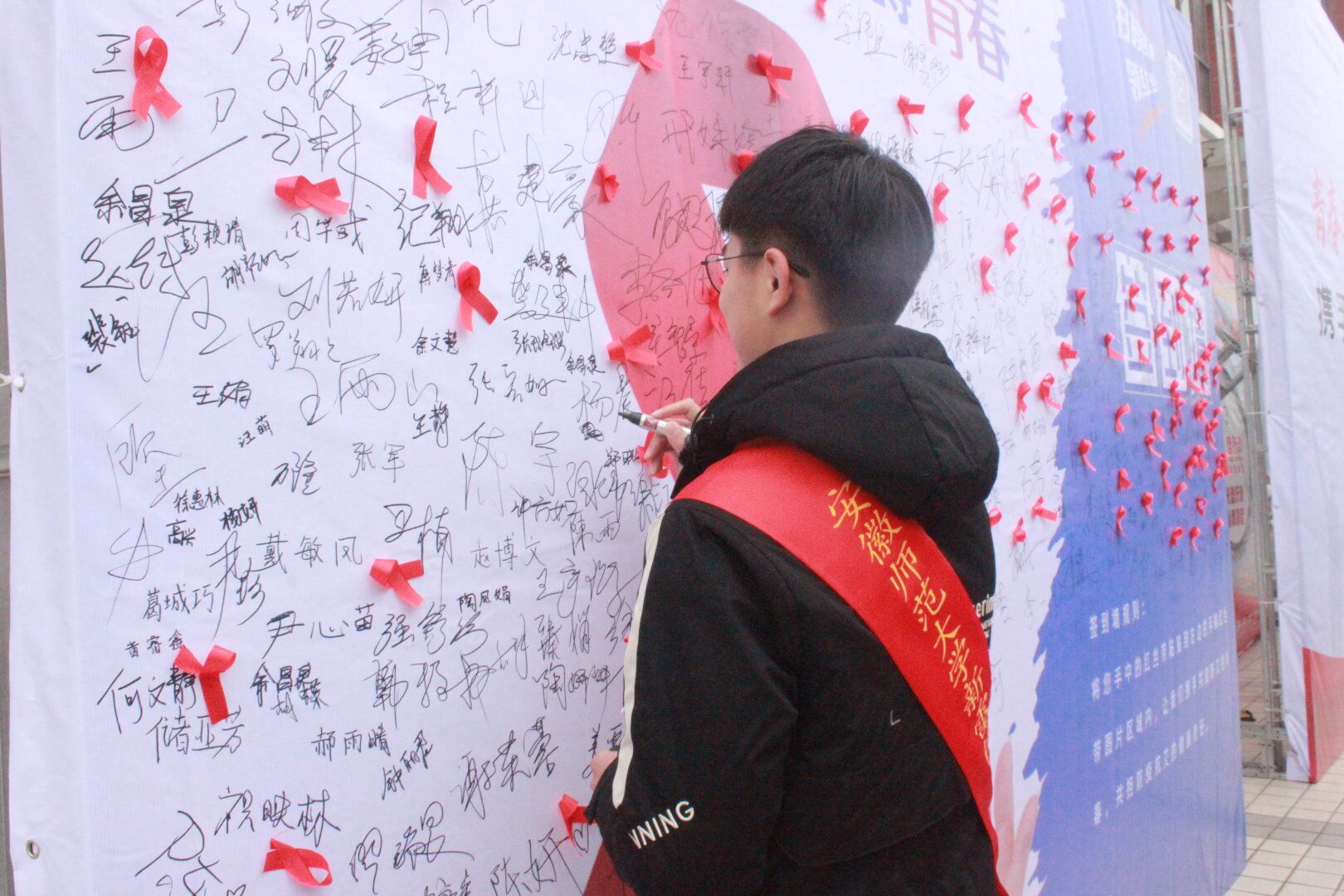 红色代表着生机、激情和鲜血,红丝带象征着我们对生命的热爱,表露着对艾滋病患者的关怀与接纳。同学们在进一步的了解有关艾滋病知识后,将自己的红丝带贴在签名墙上,并郑重的签上自己的名字。“拒绝艾滋病但不是抵制艾滋病人啊,我们更应该去关心帮助他们,而不是区别对待。”一名同学这样说到。