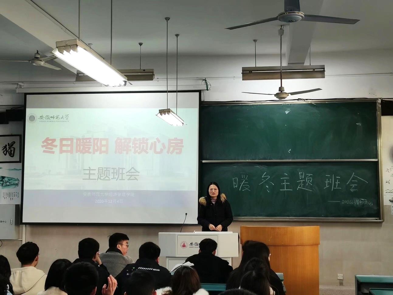 本网讯(m88官网2018级财务管理专业 窦雨雪)为加深同学们之间的了解,增强同学们的安全意识,2018级财务管理专业、人力资源管理专业和物流管理专业三个班级于2020年12月4日下午在行知楼2020302教室召开了以“冬日暖阳,解锁心房”为主题的班会。本次主题班会由辅导员盛亚琴主持,三个班级的全体同学参加本次主题班会。