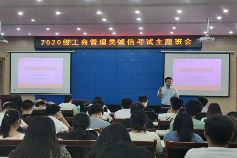 本网讯(2020级工商管理类 周成艺)期末考试将至,为教育引导同学们树立诚信考试意识,20级工商管理类于6月28日下午在校会议中心第三报告厅举办了诚信考试教育主题班会,会议由辅导员胡亮亮主持,2020级工商管理全体同学参加。