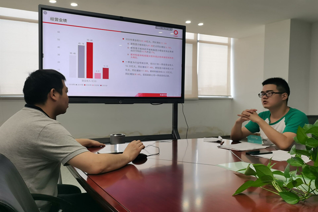 在凯盛科技股份有限公司相关负责人罗丹的热情接待下,团队开始了专题座谈。座谈开始,凯盛科技股份有限公司负责人罗丹用PPT给队员们介绍了凯盛的发展历程、原材料的来源、合作伙伴、销售状况等基本信息,队员们了解到凯盛科技有限公司与国内外厂家均有联系,主要生产显示模组、盖板、ITO、光电产品等。