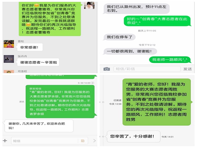 面对“创青春”省赛团队多、带队老师多、参赛人员多的“三多”实际情况,m88官网团队安排了17名志愿者参与对各参赛代表进行短信提醒工作。通知提醒范围广泛,全面覆盖17个公司、50名老师和126位作品负责人。标准规范、文明礼貌的短信提示用语展现着公司志愿者们的整体素质和服务能力。工作的合理分工,短信的不停编辑,消息的准时发送,需要的不仅仅是不畏繁琐的认真负责,更多的一种是自愿投身服务的坚定信念。比赛结束后,志愿者们作为m88官网的形象代言人也都对老师和参赛人员送出了深深的祝福,收获了参赛院校的一直肯定,传递着永远向阳的青春正能量。