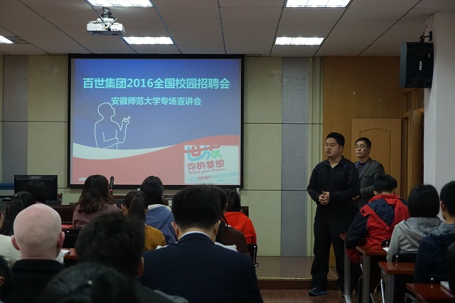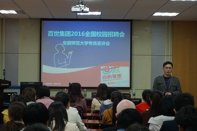 上午九点整,会议室已是座无虚席。宣讲会在一段精心制作的宣传片中开场,简洁地向大家描绘了百世公司近十年来的辉煌成长史,让广大学子认识百世、了解百世,最终以“成就商业,精彩生活,您的梦想,百世传承”完美定格,为宣讲会拉开精彩序幕。