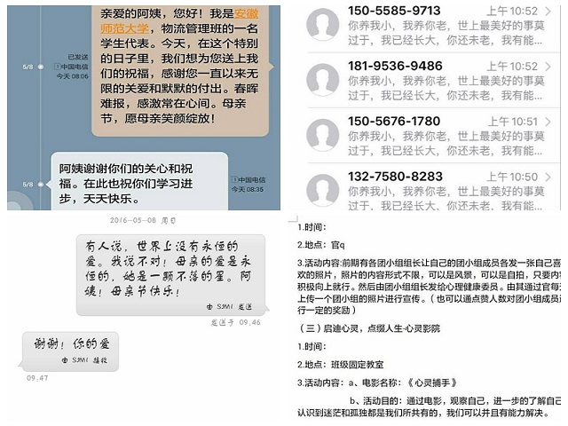 人们常说“母恩大于天”,世上最无私无悔的是母爱,为了在母亲节来临之际给于母亲最温暖的关怀,m88官网各班级纷纷参与了母亲节感恩行活动,运用短信等方式,一方面由班级将母亲节感恩的话语送给班里每位同学的妈妈,祝愿她们幸福安康,一方面又由每位同学自己于当天用自己最真挚的话温暖母亲的心。青春恰好,飞扬正当时,回忆过去一年中的悲欢喜乐,纪念班级成长中的点点滴滴,即将举办的“我爱我班,小组一家人”活动,是m88官网一些班级为了保留住记忆中的时光静好,特地组织班级小组分别拍摄一个十分钟左右的视频,形式不限,内容不限,其意义主要在于通过视频记录小组成员之间的欢乐相处,拉近彼此之间的距离,增强小组乃至班级成员之间的凝聚力,从而使班级成为一个更温馨、更和睦的大家庭。心灵为窗,启开它,为人生带来光明;照片为墙,渲染它,为生活增添美好。积极引导2015级新生通过“劳动周”活动,“劳”我所能,“动”我所得,在劳动中释放压力,收获快乐。在即将来临的“阳光心灵,美好生活照片展”活动中,各班级会组织同学每人拍一张照片组成照片展,这些照片可以是自我展示,可以是生活常态,也可以是自然风景等,活动不在乎拍摄的好坏,在乎的是能够展示员工们对生活的热爱,对美好幸福的追求,展现出经管学子不一样的风采。