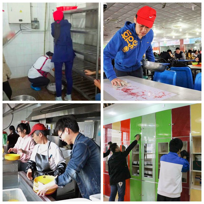 桃花要趁东风开,幸福要靠劳动来。当清晨的第一缕光芒洒向美丽的校园时,2015级的经管学子就在食堂叔叔阿姨们的带领下忙活了起来。挑菜、择菜、洗菜,这些看似简单的工作其实可大有门道,同学们仔细耐心地按照食堂阿姨们的要求和标准忙碌着;擦柜子、擦桌子、拖地,这些沉重的体力活同学们做起来没有丝毫抱怨;打饭、刷卡、卖包子,同学们微笑以待、热情相迎、礼貌询问,获得了食堂阿姨们和就餐同学们的一致好评。