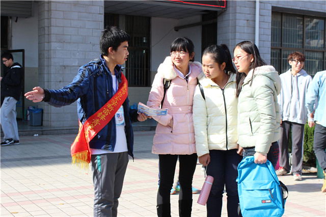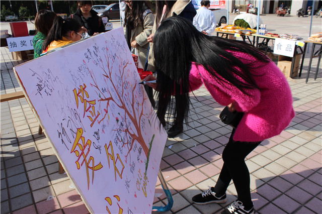 中午时分,正值放学时段,义卖现场的宣传单页、展板、海报等吸引了众多同学前来选购,一食堂南广场人潮拥挤。同学们大多结伴而来,看见心仪的商品,互相提一些选择和购买意见,志愿者们也热情大方地为前来选购的同学们进行耐心解答。南广场,欢声笑语不断,爱心义卖在此,阳光花一样地盛开。