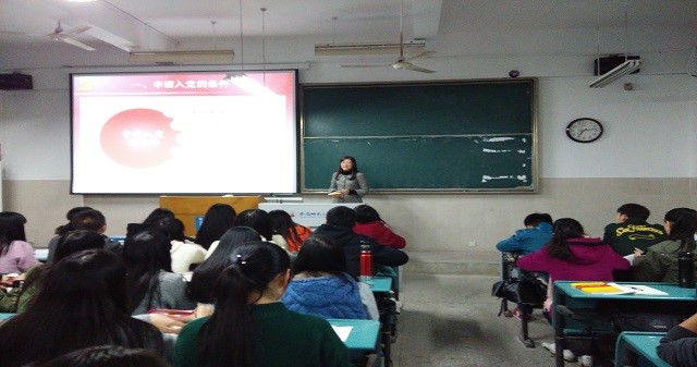 课程伊始,李书记向学员们提出了几点关于学习党章知识的要求。她指出,培训班学员应掌握培训课及教材《中国共产党的基本知识》的基本信息,学会思考,善于感悟。她鼓励学员在学习理论的同时学会灵活的将知识运用到实践中,切忌读死书、死读书。此外,她还对党员答辩的相关要求进行了大致介绍。课堂上,李书记温文尔雅的风度及一丝不苟的授课态度使得在场学员听讲愈发专注,朴实却蕴含着深刻的道理的话语让学员们收获颇丰。李书记通过列举众多党员先锋模范的优秀事迹,向大家阐释了何为“全心全意为人民服务”、何为“党员是有共产主义觉悟的先锋战士”、何为“服务奉献”等问题,并着重介绍了当前党的四大考验及四大危险,以及苏共倒台的原因。李书记强调,作为入党积极分子要追求素质的全面发展,学习成绩要保持靠前,而同时努力加强身体锻炼。最后,她希望各学员首先要在组织上入党,以党员的身份要求自己,之后更要在思想上入党并祝愿学员们能够早日加入伟大光荣的共产党。