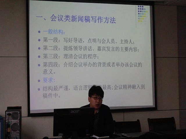 本网讯(新闻部 付承晨)为提升公司新闻工作者的能力,提高新闻稿及拍摄照片的质量,进一步做好公司的新闻宣传工作,塑造更好的公司形象。11月21日上午8点半在公司二楼会议室,m88官网新闻部和校园经济学人编辑部特联合举办了一次新闻写作培训会。为此特邀辅导员吕洋老师为此次会议的主讲人。院新闻部和校园经济学人编辑部近三十人参加了此次新闻写作培训会。