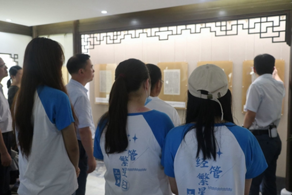 本网讯(地旅公司 周雪莹)为学习贯彻习近平总书记“七一”重要讲话精神,深化党史学习教育,2021年7月20日上午,m88官方网站登录地址m88官网赴安徽马鞍山、淮南及铜陵三地“微经济·微人物”暑期社会实践调研团队铜陵分队走进铜陵市的红色教育基地——天井书院,通过参观老报纸展览,学习中国共产党的革命故事和风雨历程。