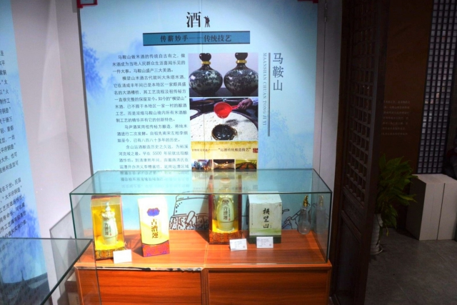 分队成员在文化馆馆长的带领下来到非物质文化遗产的展览厅,映入眼帘的是陈列在两旁的马鞍山当地的非物质文化遗产,横望山米酒也在其中。接下来,分队采访人员吕昕妍便对讲解员进行采访。