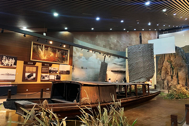 渡江战役是继辽沈、平津、淮海三大战役之后,又一个具有决定性的战略进攻战役,合肥市渡江战役纪念馆是由渡江战役纪念馆、胜利纪念广场以及综合配套建筑三部分组成。团队一行人走近纪念馆,便被其木船形状的外观造型所吸引,队长结合渡江战役胜利的历史意义解释了纪念馆造型设计的缘故,她说:“纪念馆的造型就像两艘乘风破浪的巨型战舰,并排行驶在浩瀚的水面上,舰首直指前方长江。”