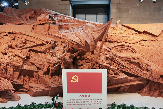进入纪念馆后,首先看到的是一组大型雕塑,雕塑的前面则立着入党誓词,队员们驻足在雕塑前,静静地观察上面呈现的历史画卷,默念着入党誓词,切身感受“百万雄师过大江”的蓬勃气势,在战火纷飞年代的共产党人坚守信念,为实现民族独立和国家富强不断努力,表现出革命英雄主义和革命乐观主义精神。馆内有许多具有现代化因素的设备,队员们在历史和现代的交织中接受着红色文化的教育,利用这些设备了解相应的展品,还跟随着机器人的脚步回顾这一伟大的革命战役,现代信息技术的应用更让这一历史鲜活起来,发挥革命文物在党史学习中的作用。