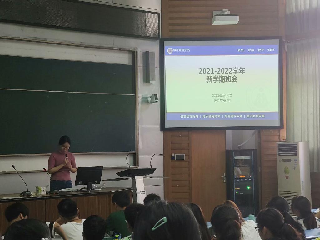 本网讯(吴敬之 陈醒醒/文)为了帮助同学们明确新学期的学习方向,尽快进入学习状态,2020级经济学类于9月8日上午在行知楼教室召开了新学期班会,本次会议由辅导员吴敬之主持开展。