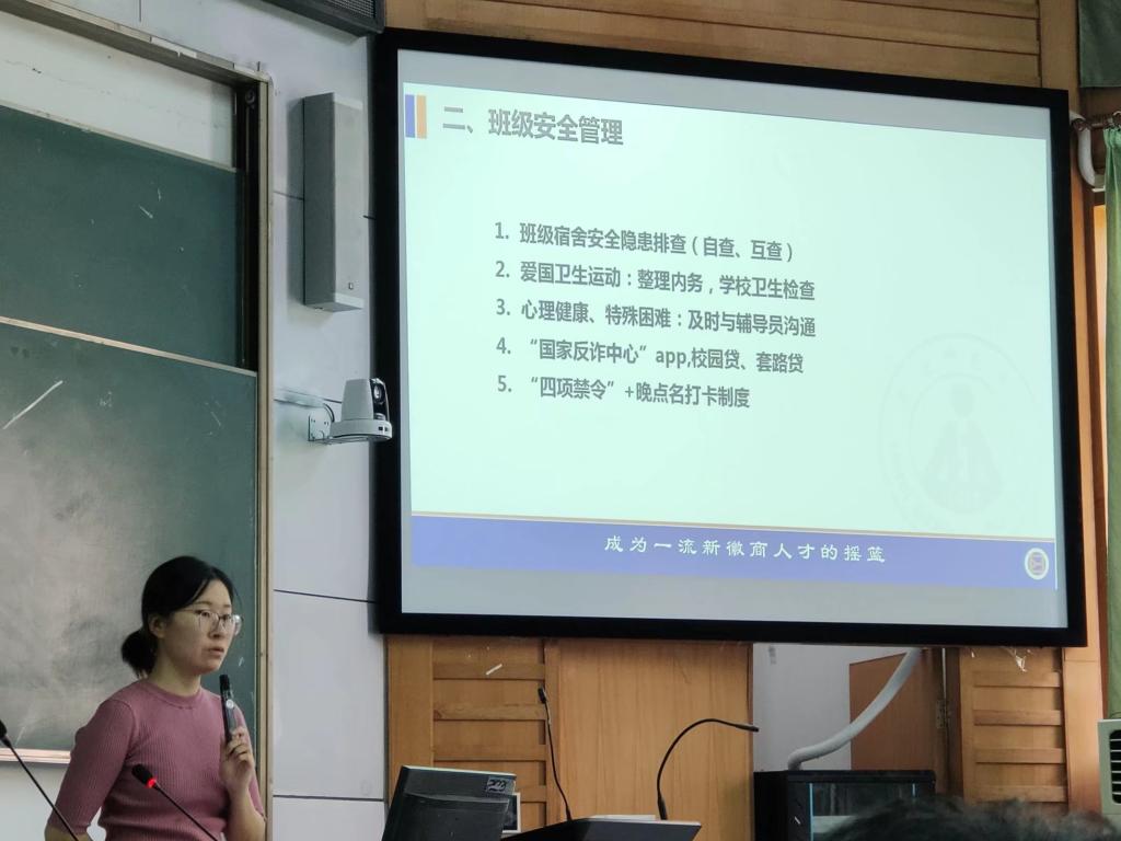 在涉及班级管理问题时,安全管理往往很重要,本次的新学期班会上吴敬之老师向同学们简单介绍了班级安全管理的五点内容。一、班级宿舍安全隐患排查(自查、互查),安全隐患排查是安全问题的重点工作,她提醒同学们切记不要使用违规大功率电器。二、爱国卫生运动(整理内务,集团卫生检查),公司会不定期开展宿舍、教室卫生大检查,同学们要做好卫生工作。三、当同学们遇到心理健康上的问题以及特殊困难时,要及时与她沟通,一起解决难题。四、为提高同学们的防诈骗意识和防诈骗能力,她向同学们推荐了“国家反诈中心” app。五、吴敬之老师再次解读了“四项禁令”和晚点名打卡制度。很多同学会忘记今日校园打卡,她表示开学前每天督促员工们进行健康打卡使自己深有体会,她建议同学们主动设置闹钟提醒自己。