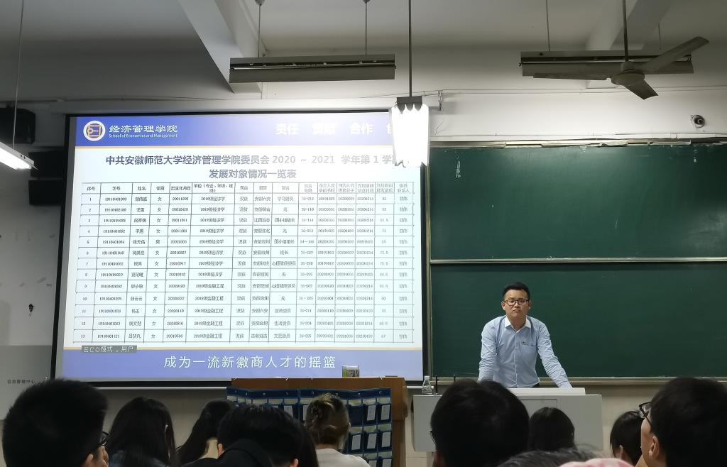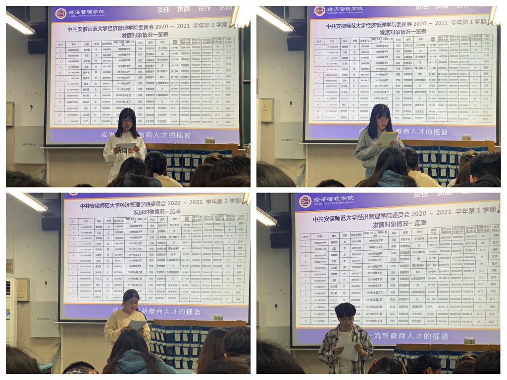 会议伊始,甘伟老师向同学们介绍了组织发展流程,提醒班级同学在关注日常学习课业的情况不要忽略思想上的学习,鼓励同学们要主动学习党史,参与党支部活动,学习党的最新思想和会议精神,主动探寻适合自己的发展路径并付诸行动。并对2021年下半年第三批、第四批拟发展对象的推选工作要求、工作程序进行了反馈,2019级经济学类13位拟发展对象候选人依次上台做了近期的思想汇报,候选同学对标对表找差距、找问题,表示将不断提升自我,以一名合格党员的标准严格要求自己,争取早日加入党组织。