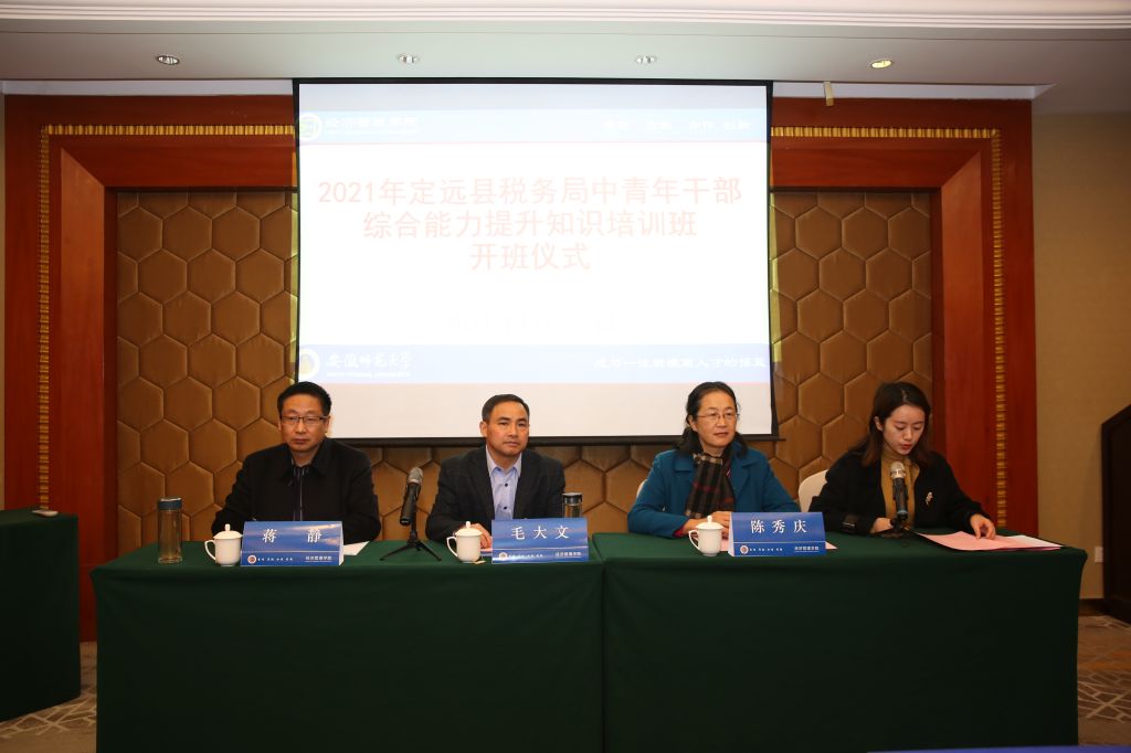本网讯(m88官网 于琼)11月22日,受定远县税务局委托、m88官网承办的定远县税务局中青年干部综合能力提升知识培训班,在金鹰尚美酒店举行开班典礼。定远县税务局党委书记、局长毛大文,定远县税务局党委委员、纪检组长蒋静,公司党委书记陈秀庆,定远县税务系统45名中青年干部参加了开班典礼,典礼由培训班班主任于琼主持。