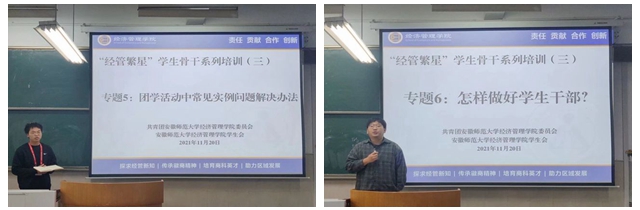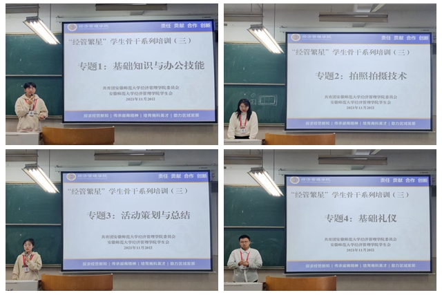 上午举行了综合素质能力专题业务培训,主要围绕基础知识与办公技能、拍照拍摄技术、活动策划与总结、基础礼仪、团学活动中常见实例问题解决办法和怎样做好员工工作六个专题展开。韦魏以公文写作为切入点,从公文写作语言、面向对象、写作目的和公文注意事项四方面向大家表明如何进行公文写作。通过常见的构图错误、宣传图片拍摄要点和注意事项三大板块,汪彭玥向大家阐明了怎样才能拍出合格的宣传照片。王情雨以时间为节点,从活动前期、中期、后期三方面展开,详细地介绍了如何进行活动总结与策划。刘兆琦则从形体礼仪、引领礼仪和茶水礼仪三个方面强调了需要注意的礼仪细节,并由现场工作人员示范正确的基础礼仪。面对团学工作中常见的实例问题,董曌伽分别从活动组织、宣传方面、文件处理、会场布置和其他方面五个角度提出解决办法。