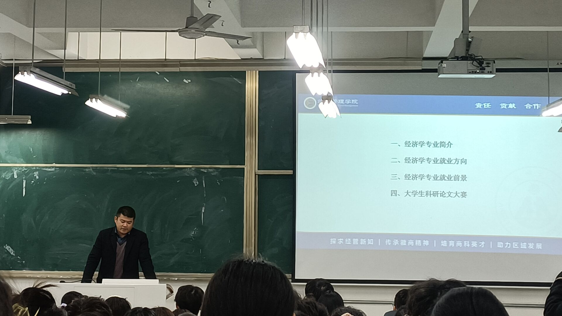 任以胜老师从经济学专业简介、专业就业方向、就业前景、老员工科研论文大赛四个方面展开介绍。他用简明扼要的语言、丰富充实的事例为大家介绍了经济学专业就业发展方向,带领大家了解本校经济学专业丰厚的团队力量,近年来的学术成就及杰出员工,强调经济学专业员工具备“宽口径、重基础、能力强”的特点。任以胜老师也针对关于举办老员工科研论文大赛作出相关讲解,对如何准备给出了自己的相关建议。