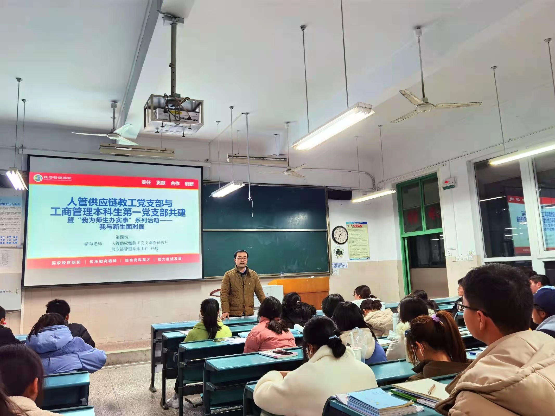 2021年12月2日晚上7:00,在教学楼2号楼102教室,人管供应链教工党支部与工商管理本科生第一党支部共建暨“我为师生办实事”系列活动——“我与新生面对面”第四场顺利举行。本次活动由人管供应链教工党支部党员教师、供应链管理系系主任杨康主讲,工商管理本科生第一党支部书记刘胡海主持。同时还有21级工商管理二班同学参与活动。