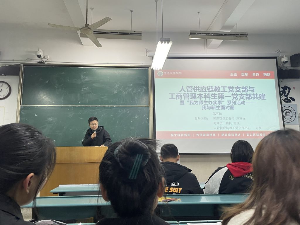 2021年12月14日晚,人管供应链教工党支部与工商管理本科生第一党支部共建暨“我为师生办实事”系列活动——“我与新生面对面”第五场顺利举行。本次活动由芜湖银保监分局汪苇杭,芜湖奥一精机张楠主讲,人管供应链教工党支部书记方昶主持。同时还有21级工管三班及ACCA班全体同学参与活动。