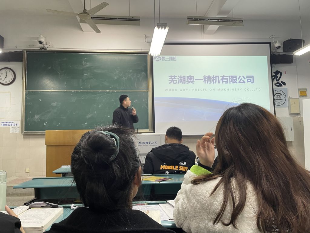 张楠第一个上台向同学们分享,他先简单地介绍了公司,表明公司主要经营精密减速器,非标设备专用夹具制造,销售,汽车零部件加工。接着,他向同学们简单阐述了公司几个运营机器的运作原理并播放了相关视频辅助理解。同时他也就自身经验告诫同学们不要挂科,特别是专业课程,书本中的知识会在实践中得到运用;要多多增加实习经验,并表明机器人行业发展迅速,取代人工是一种趋势。最后,他也就同学们提问的公司管理模式,薪资待遇等一一作出了解答。