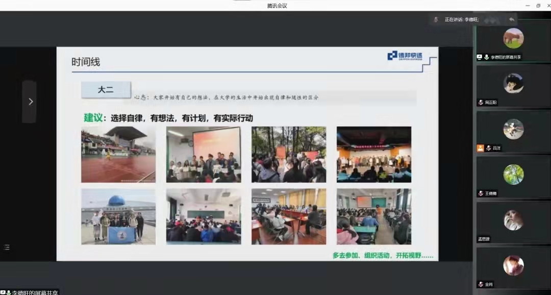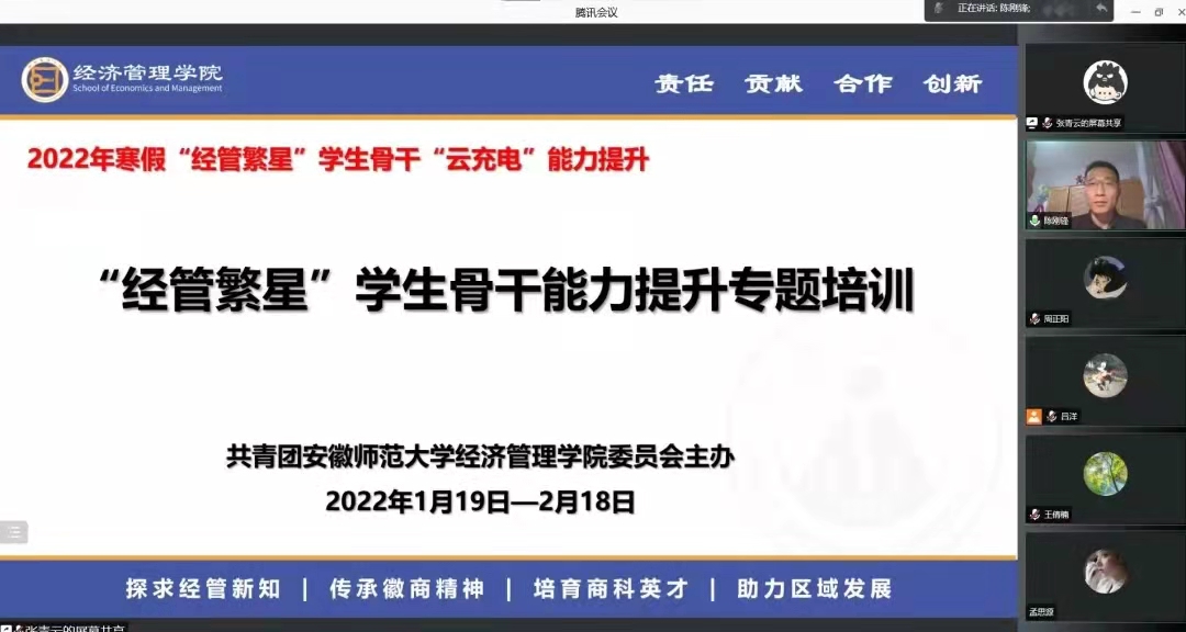 1月20日,专题培训第一期通过腾讯会议线上开展,公司党委副书记陈刚锋、院团委书记吕洋,团委、员工会全体成员及公司各年级各专业班委共300人参加。陈刚锋向与会同学介绍了员工骨干线上培训的目的和安排,强调员工骨干要珍惜平台和机会,充分利用寒假时间,主动学习,提升商科员工专业素养和综合能力。公司2017级物流管理专业优秀毕业生分享了自己从员工会主席走向工作岗位的经历和经验,以自己大学四年时间管理、能力提升展现了自己的成长过程。