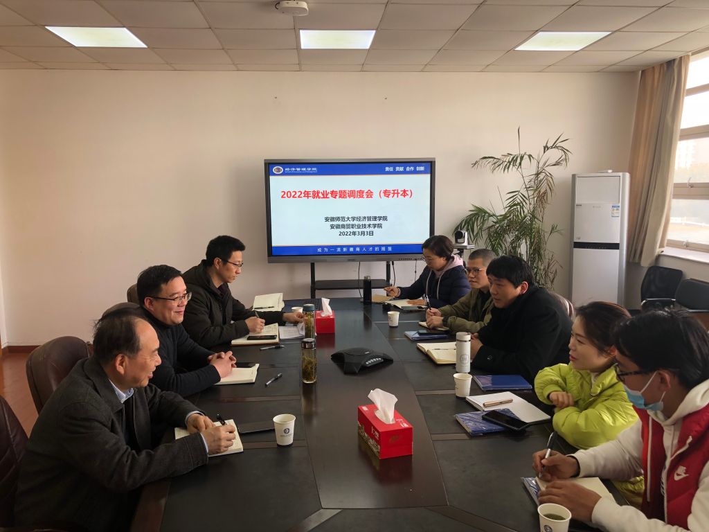 为了推进2022届毕业生(专升本)就业工作,3月3日下午,m88官网与专升本联合培养单位安徽商贸职业技术公司相关公司召开就业工作专题调度会。会议由公司党委副书记陈刚锋主持,m88官网经理张廷龙,商贸公司电子商务公司党总支书记魏力,会计公司经理丁增稳等一行参加会议。