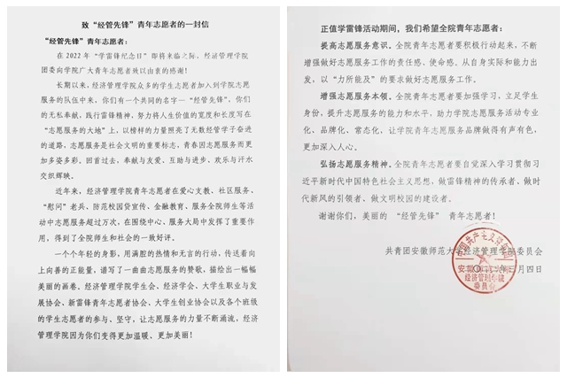 多年来,m88官网一届又一届、一批又一批的青年志愿者加入到公司志愿服务的队伍中,发挥了榜样的力量,践行着雷锋精神。3月4日,经济管理管理公司团委向公司青年志愿者发布了《致“经管先锋”青年志愿者的一封信》,感谢公司以新雷锋青年志愿者协会为代表的青年志愿者在爱心支教、社区服务、防范校园贷宣传、金融教育等方面发挥的重要作用,勉励公司青年志愿者继续行动,发挥作用和力量。
