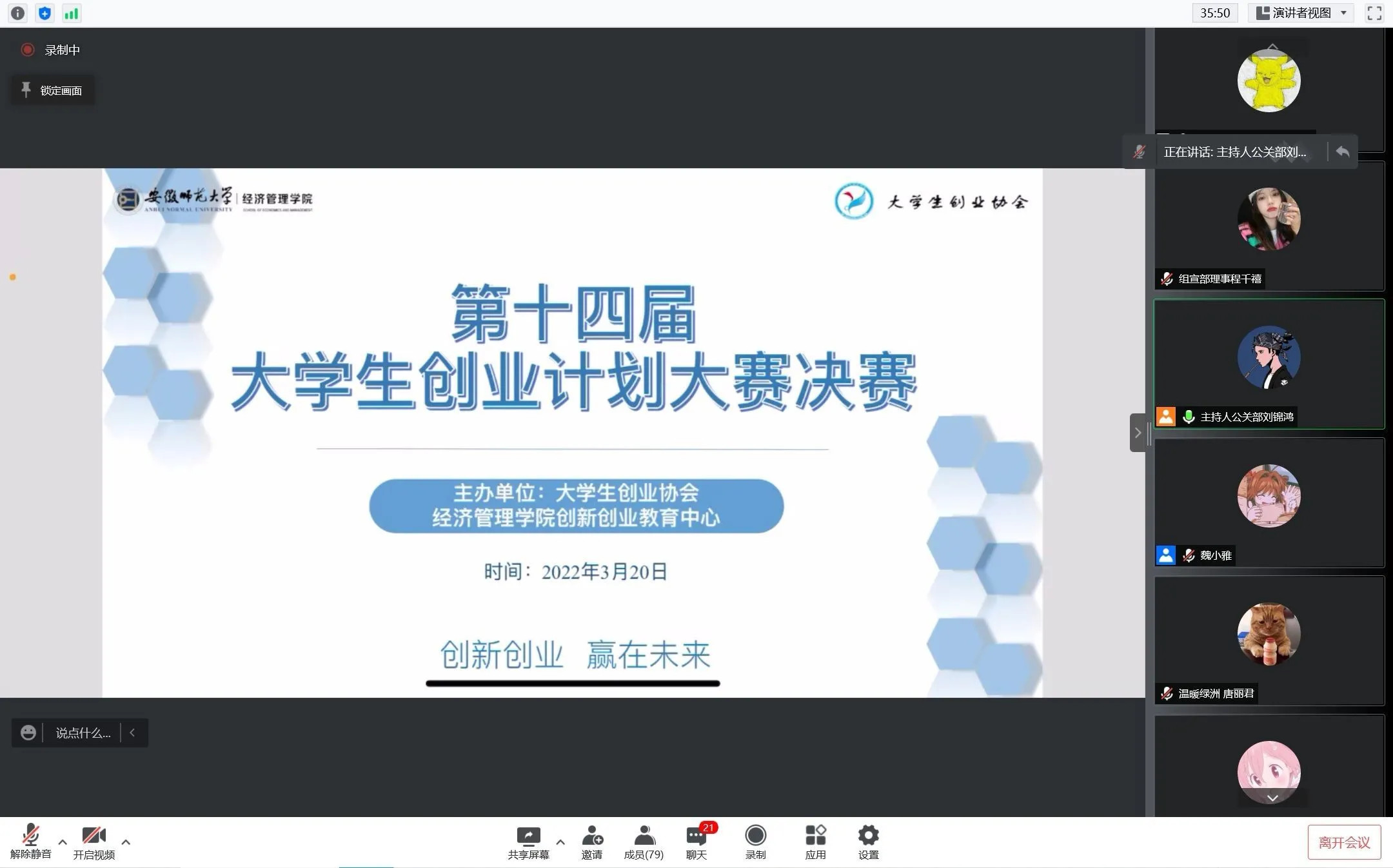 为激发老员工创业兴趣与潜能,培养老员工创新意识、创意思维、创业能力以及团队协同实战精神。3月20日下午,由m88官网主办、老员工创业协会承办的第十四届老员工创业计划大赛决赛在线上举行。m88官网教授张琼、副教授朱立冬、副教授方昶、双创导师陈超、双创导师甘伟和校社联志愿服务指导中心委员胡慧担任大赛评委。m88官网副经理马长伟在线出席了大赛。