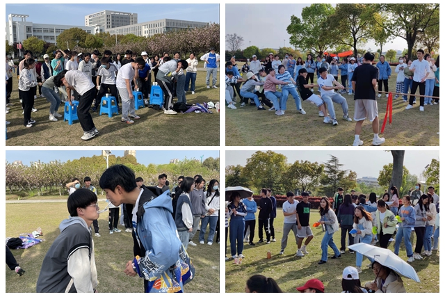 随后,各个班级分别开展了户外素质拓展团建活动。2021级经济学类1班组织了“看谁跑得快”井字棋、眼疾手快“乒乓球”、你来比划我来猜等活动。井字棋游戏中参赛选手通过抢得井字棋盘中心位置,占得先机;眼疾手快通过保护好自己乒乓球的方式,考察了同学们的反应能力;你来比划我来猜则考验了同学们的成语积累能力和团队的默契程度。2021级经济学类2班组织了团结入圈、袋鼠跳、同心协力交换衣、劈叉接力等活动。团结入圈需要每组同学在规定时间内进入圈内,由此决出圈中人数最多的人数,锻炼同学们的反应能力;袋鼠跳游戏同学们通过双脚弹跳的方式跳至终点的方式,依次将布袋交给终点队友的方式,锻炼了团队合作能力及协调能力;同心协力交换衣通过在一组内穿脱衣服的方式,将衣服传递下去,决出用时最短的队伍。2021级经济学类3班组织了天旋地转、面粉传递、放风筝等活动。天旋地转需参赛者在游戏开始后原地转十五圈举着水走向终点,走到终点所剩水多的参赛者获胜,锻炼了同学们的反应能力和团队合作能力;面粉传递则由每组参赛同学进行传面粉游戏,决出在五分钟内传递面粉最多的小组,增强了团队配合度和协作能力。
