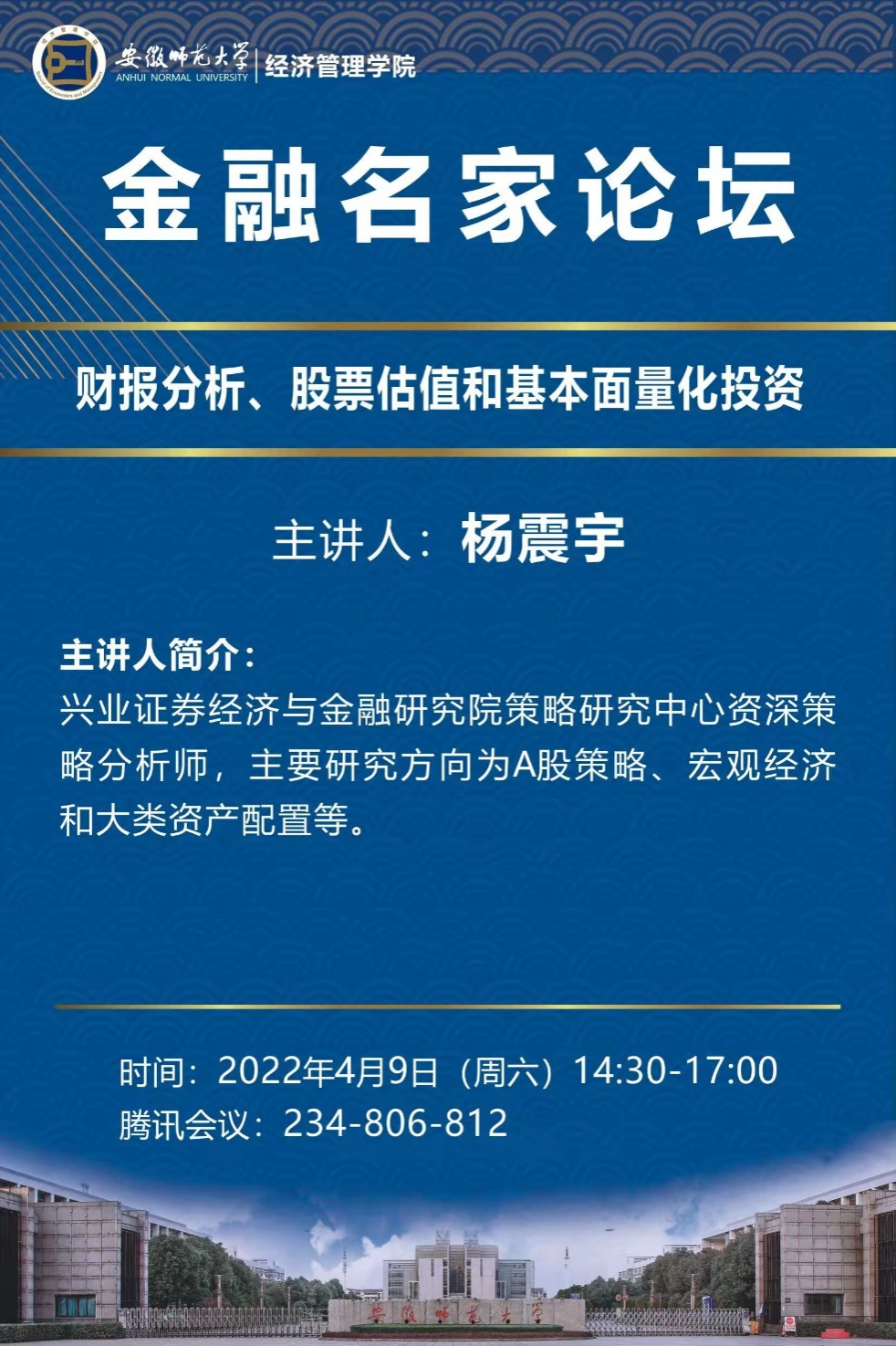 2022年4月9日,m88官网金融名家论坛第二讲开讲。兴业证券经济与金融研究院资深策略分析师杨震宇博士受邀作了题为“财报分析、股票估值和基本面量化投资”的投资策略分享。