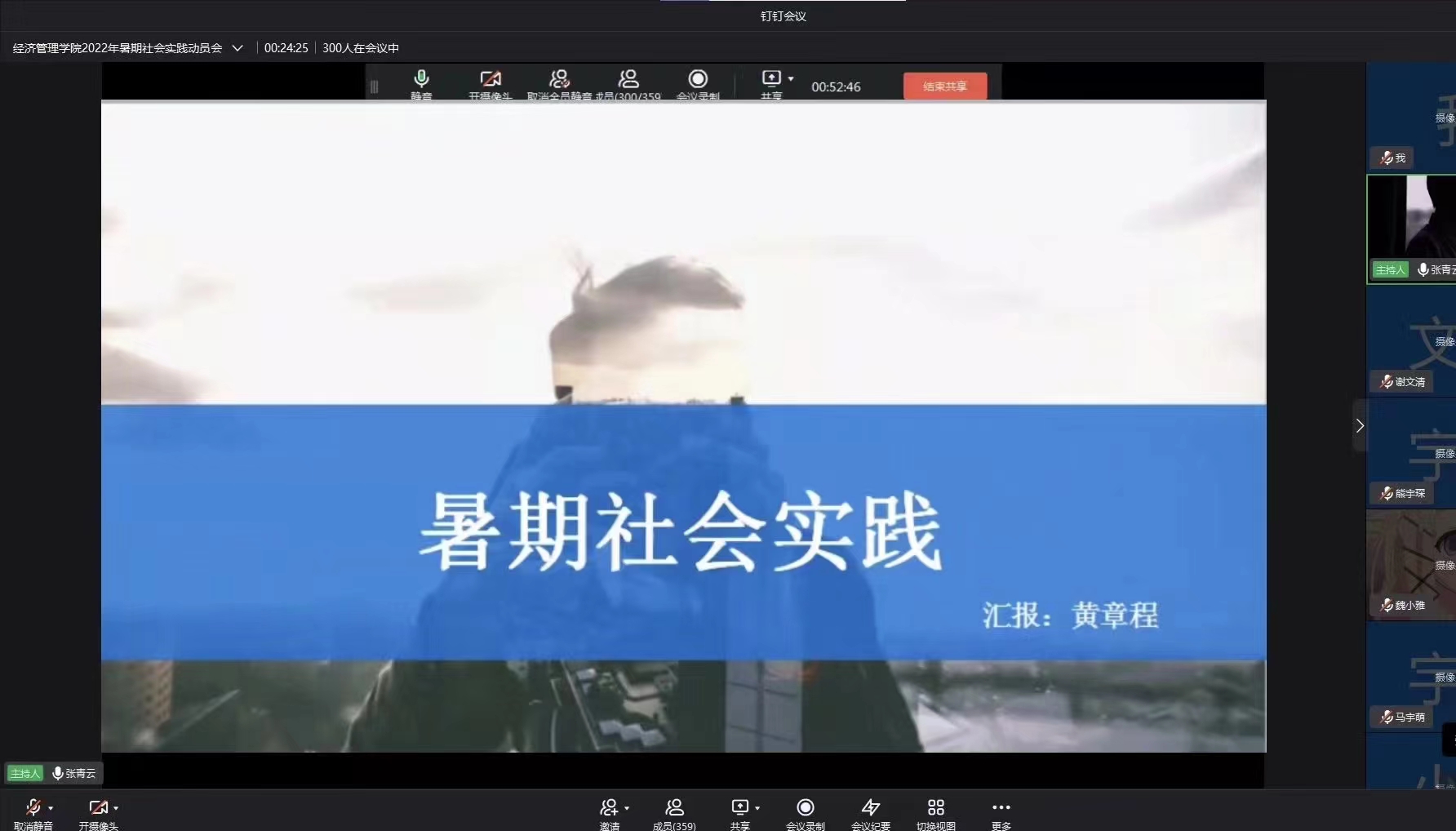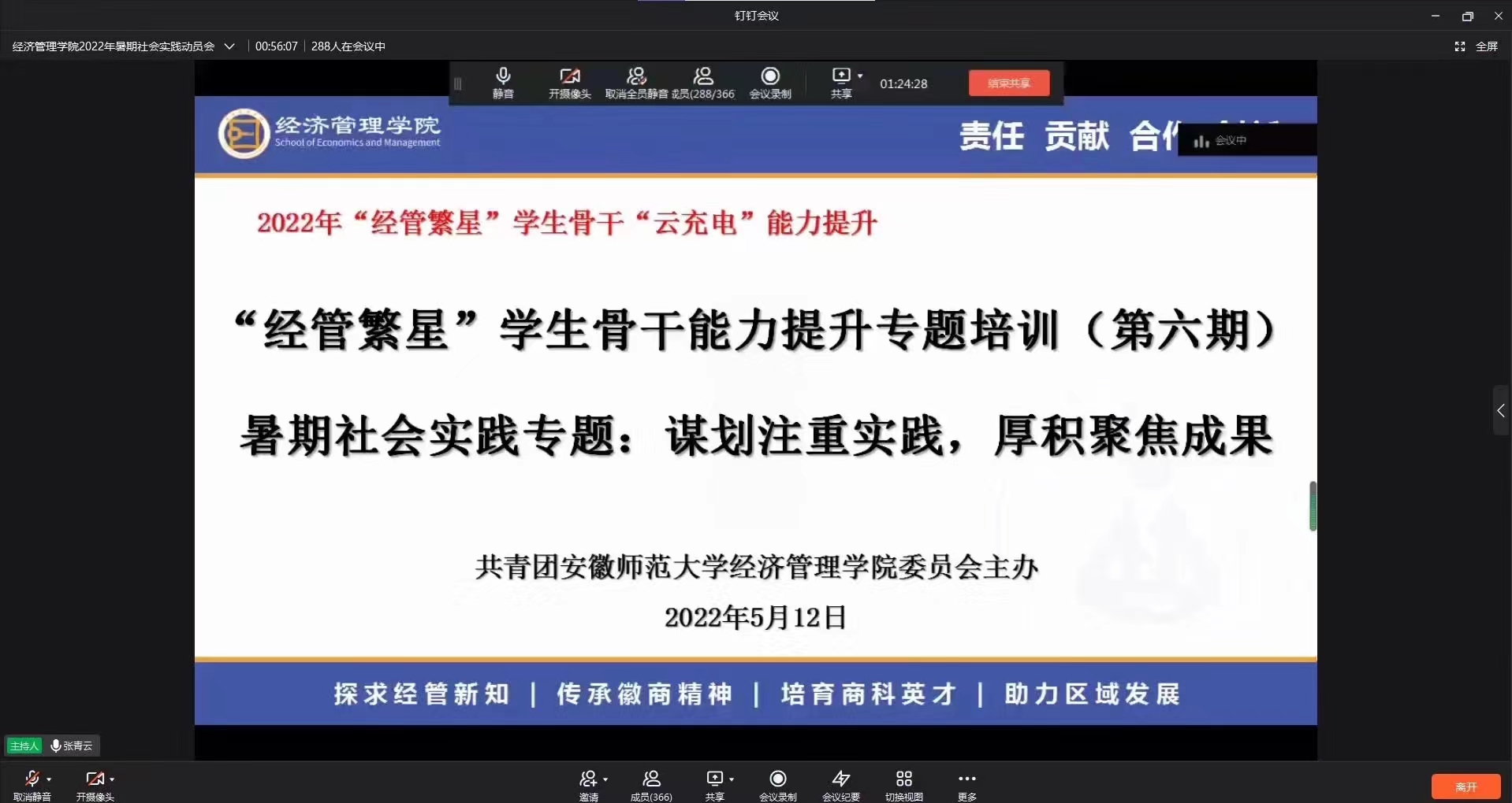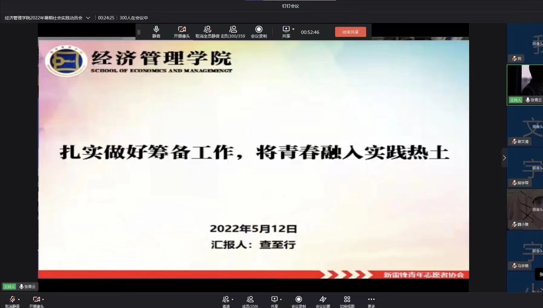 韦魏、黄章程、查至行三位往年带领团队进行暑期社会实践并取得优秀成绩的同学向参会同学分享经验。他们围绕“谋划注重实践,厚积聚焦成果”、“暑期社会实践项目的策划与实施”、“扎实做好筹备工作,将青春融入实践热土”进行了专题分享。相关团队负责人从暑期社会实践的准备、过程中可能遇到的问题、收获体验等角度进行了阐释,详细介绍了暑期社会实践的相关流程,并结合去年的切身经历分享了细致入微的经验教训。