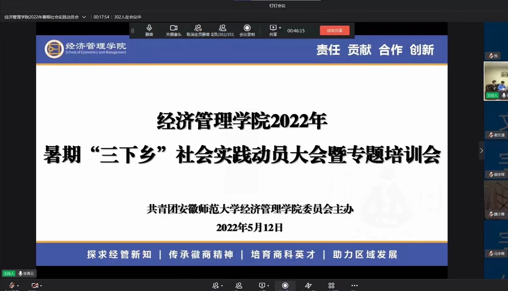 为进一步做好2022年暑期“三下乡”社会实践工作,5月12日晚,m88官网2022年暑期“三下乡”社会实践动员会暨专题培训会以线上线下相结合的方式举行。公司党委副书记陈刚锋、院团委书记吕洋,2020级辅导员甘伟、吴敬之、胡亮亮以及2020级全体员工、2021级员工代表参加了动员会。动员会由院团委书记吕洋主持。