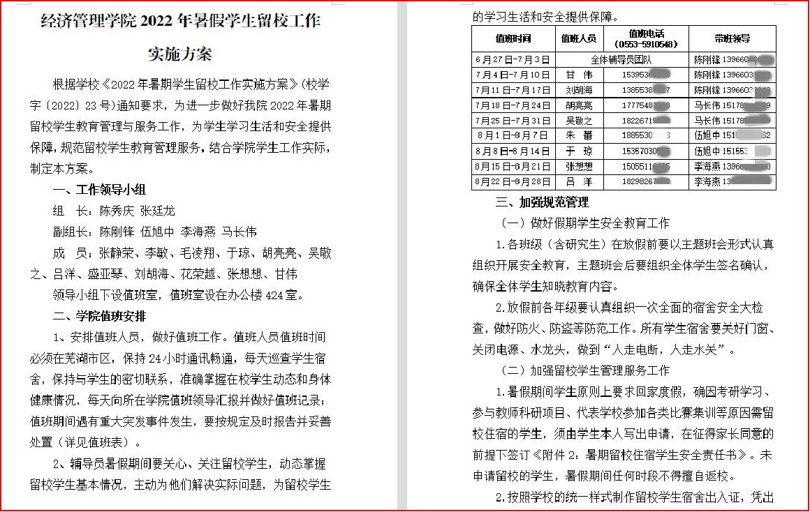 为了做好暑期员工留校工作,公司制定暑期员工留校工作方案,成立领导组。完善线上员工留校申请、线下备案审批程序,严格审查员工留校原因、留校时间段、家长知情同意书等信息,确保了留校员工人数清、情况明、信息实。公司召开暑期员工留校安全教育大会,提醒员工守住安全底线,遵守校院暑期管理规定,做到“安全留校、安心备考”。公司召开教学管联席会议,落实全员参与留校员工教育管理服务工作,安排院领导、留校员工带班辅导员、本科生导师、硕士生导师值班值守,严格执行离校审批、晚点名制度。全力保障留校员工度过一个安心、舒心、充实、高效的暑期。