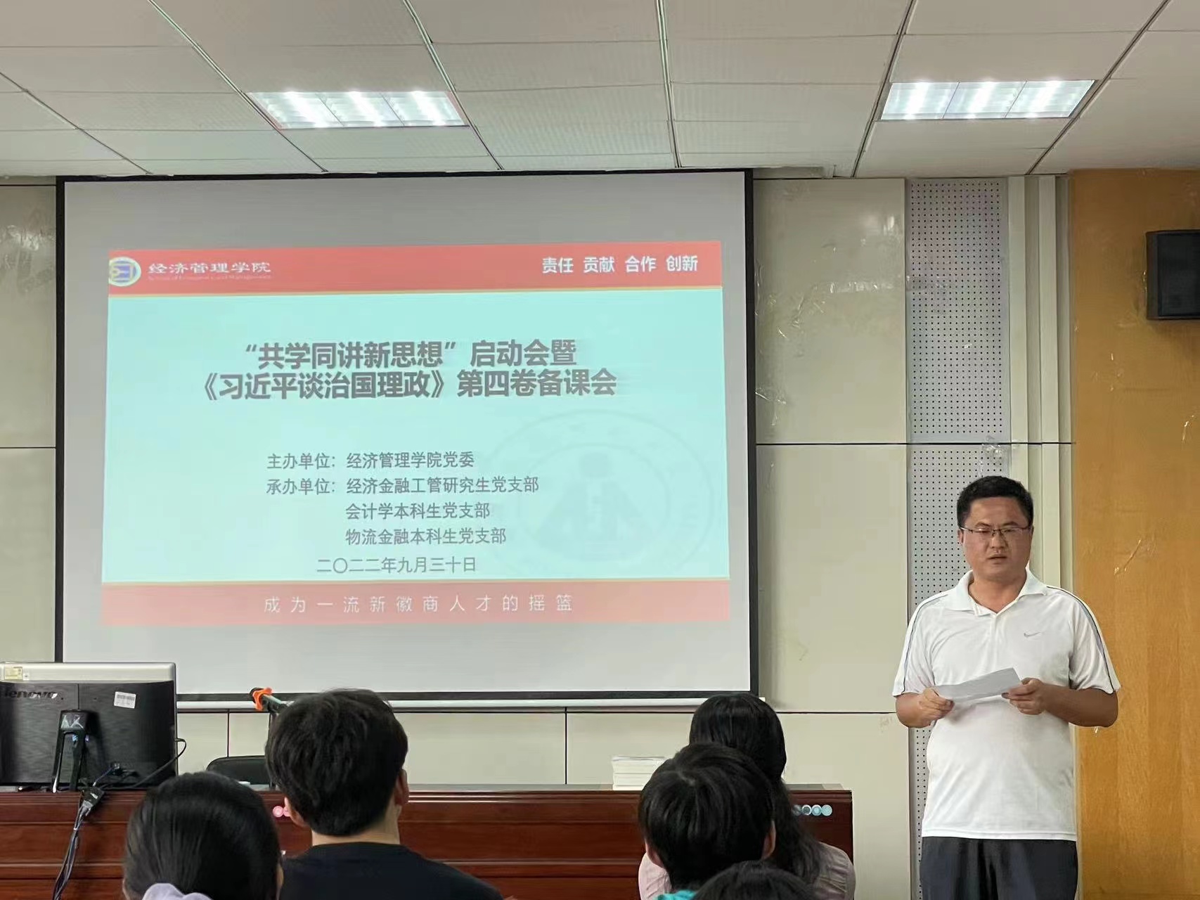 为深入加强党支部成员日常理论学习,m88官网9月30日下午召开了“共学同讲新思想”精品党课启动会暨《习近平谈治国理政》第四卷备课会,会议由会计学本科生党支部书记胡亮亮主持,公司党委书记陈秀庆出席指导,经济金融工管研究生党支部书记陈龙、物流金融本科生党支部书记吴敬之、员工党支部部分支委参加。