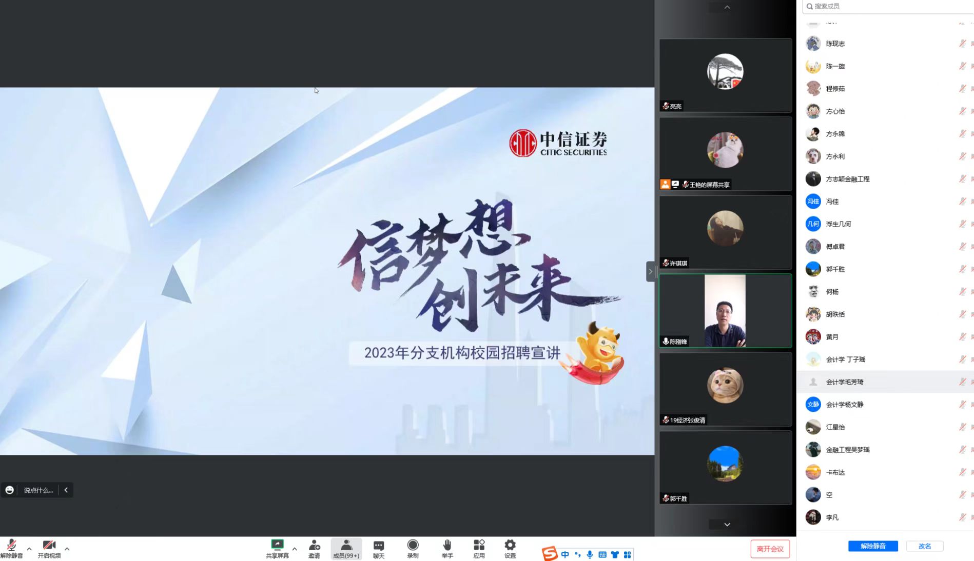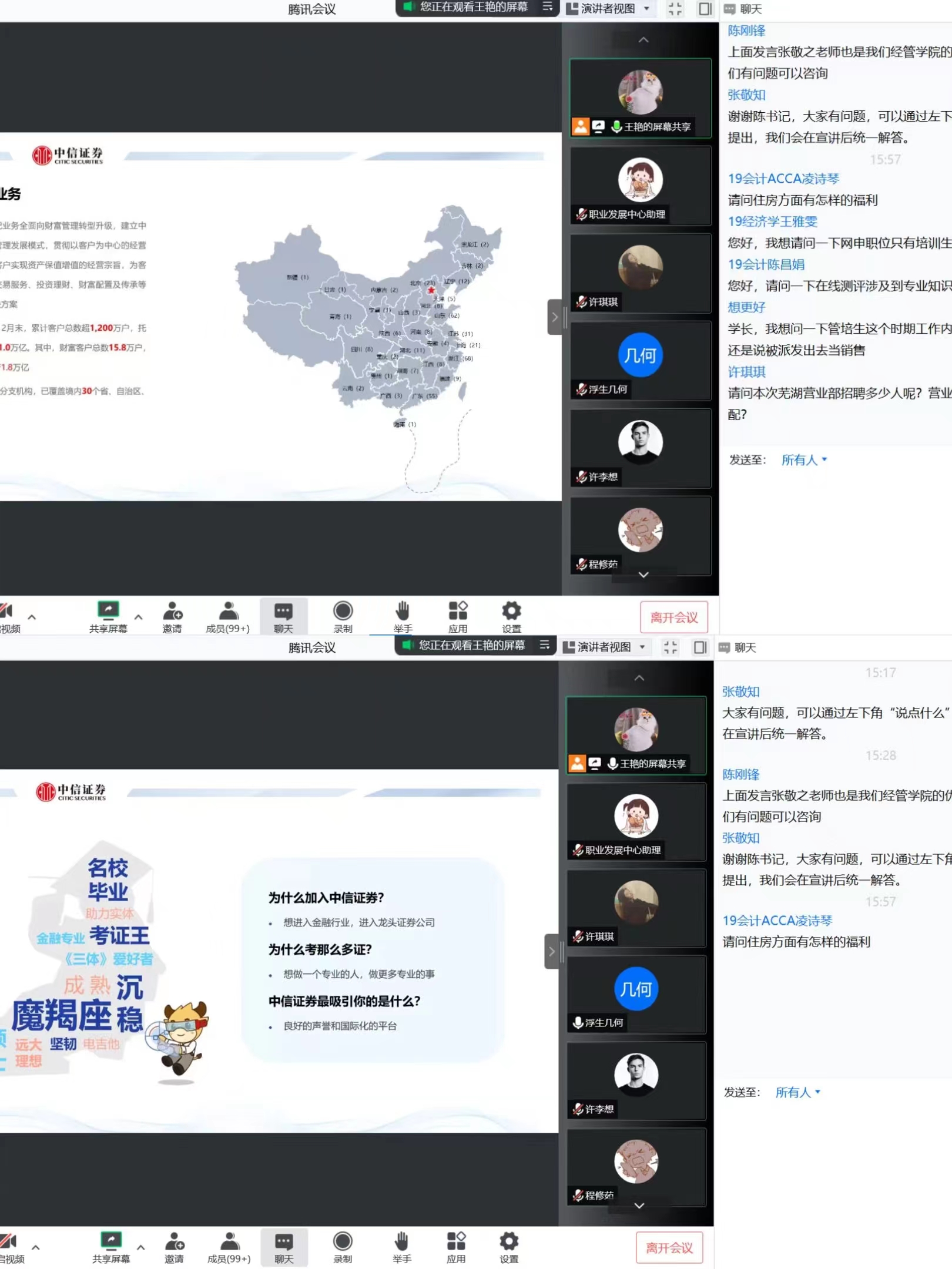 为了更好地促进毕业生就业,10月12日下午公司邀请中信证券举办了2023届毕业生线上招聘宣讲会。公司党委副书记陈刚锋和毕业生在线参加。